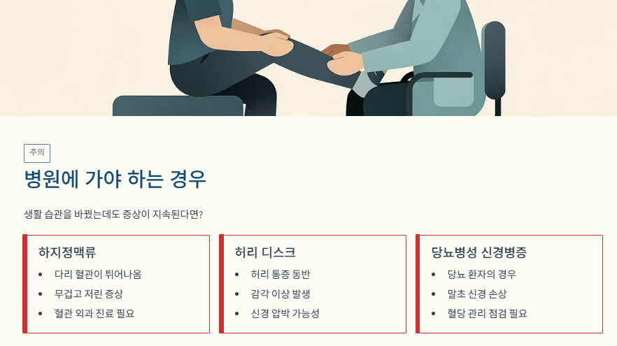 - 하지정맥류: 다리 혈관이 튀어나오거나 무겁고 저린 증상이 동반된다면 혈관 외과 진료가 필요합니다.