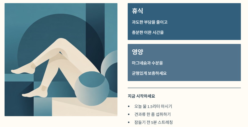 - 마그네슘 섭취와 자기 전 5분 스트레칭은 밤의 평화를 되찾아주는 가장 강력한 도구입니다.