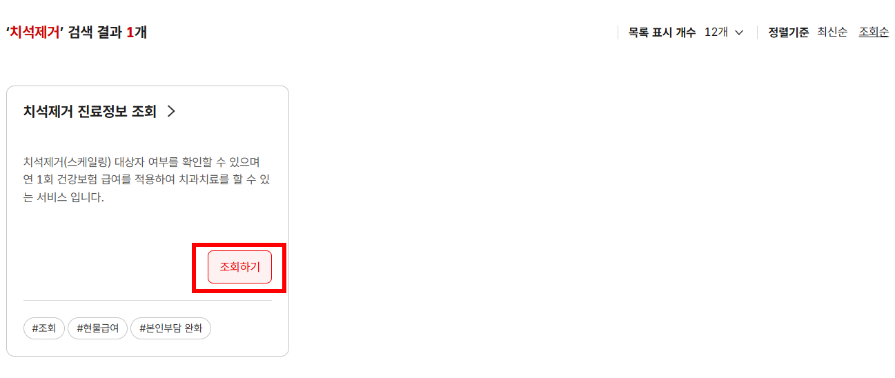 (5) 치석제거 검색결과 1개를 확인할 수 있고, 아래 조회하기를 클릭합니다.
